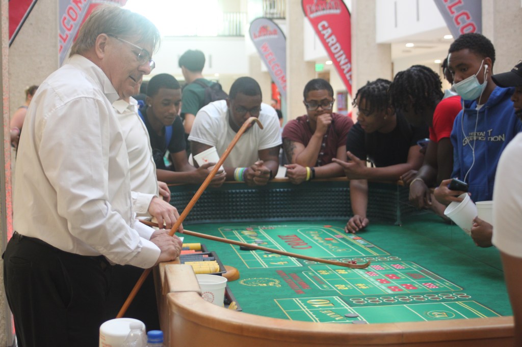 A group of students around gather around a gambling table with two dealers on the night of Aug 27.